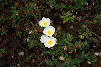 - Esta referência ocorreu-me porque comecei a reparar, de há uns anos a esta parte, nas minhas deambulações de trabalho, à volta de Leiria, principalmente nas bermas das estradas, esta flor muito alva e, nalguns casos, pintalgada por 5 pinceladas de cor púrpura. E assim cheguei à, pelos vistos, vulgar, esteva, que ocorre por muitas das zonas de mato do centro e sul de Portugal.